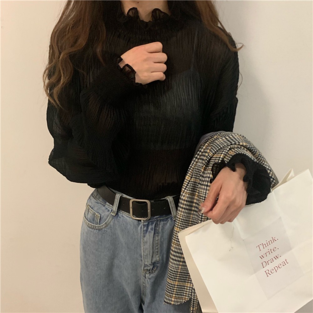 長袖スウィートスピーカースリーブホワイトブラックアプリコットシャツ?ブラウス