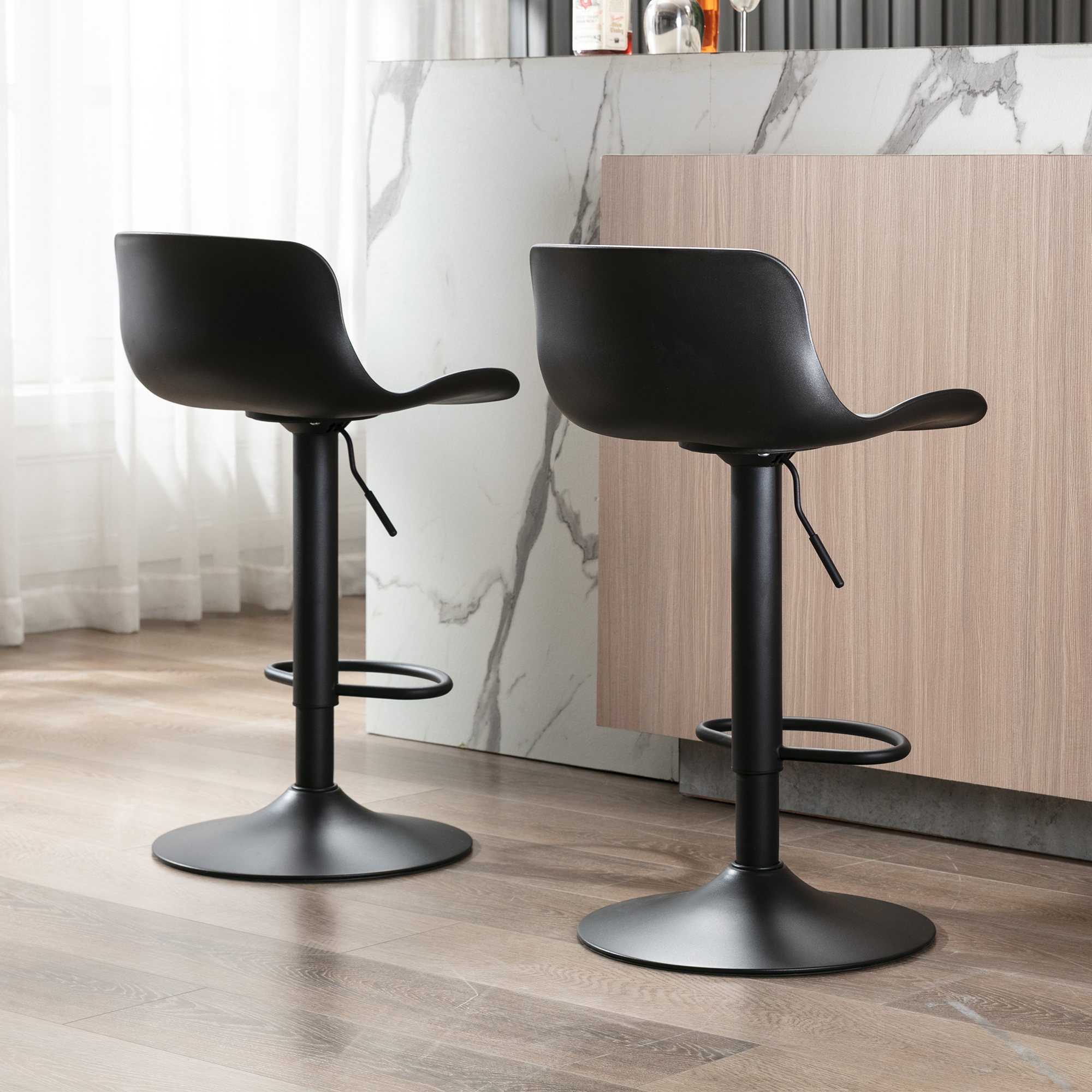 HUMANITY IN DESIGN:Shell back design with a strong sense of the modern city.The curved seats make you more comfortable. You can lean against the back of the bar chairs and put your legs on the footrest for a better sitting position.