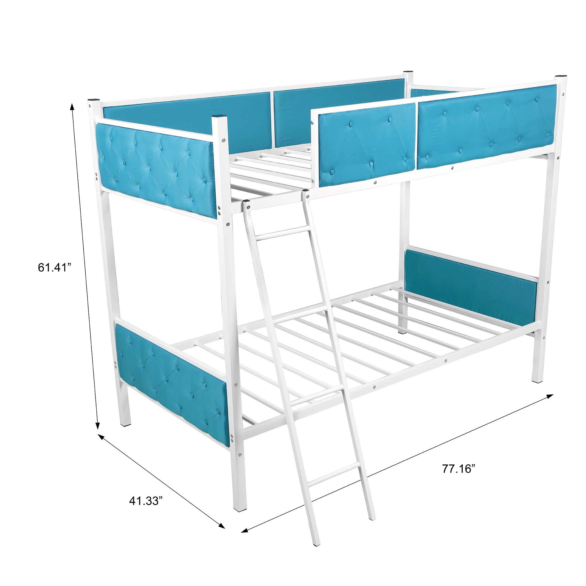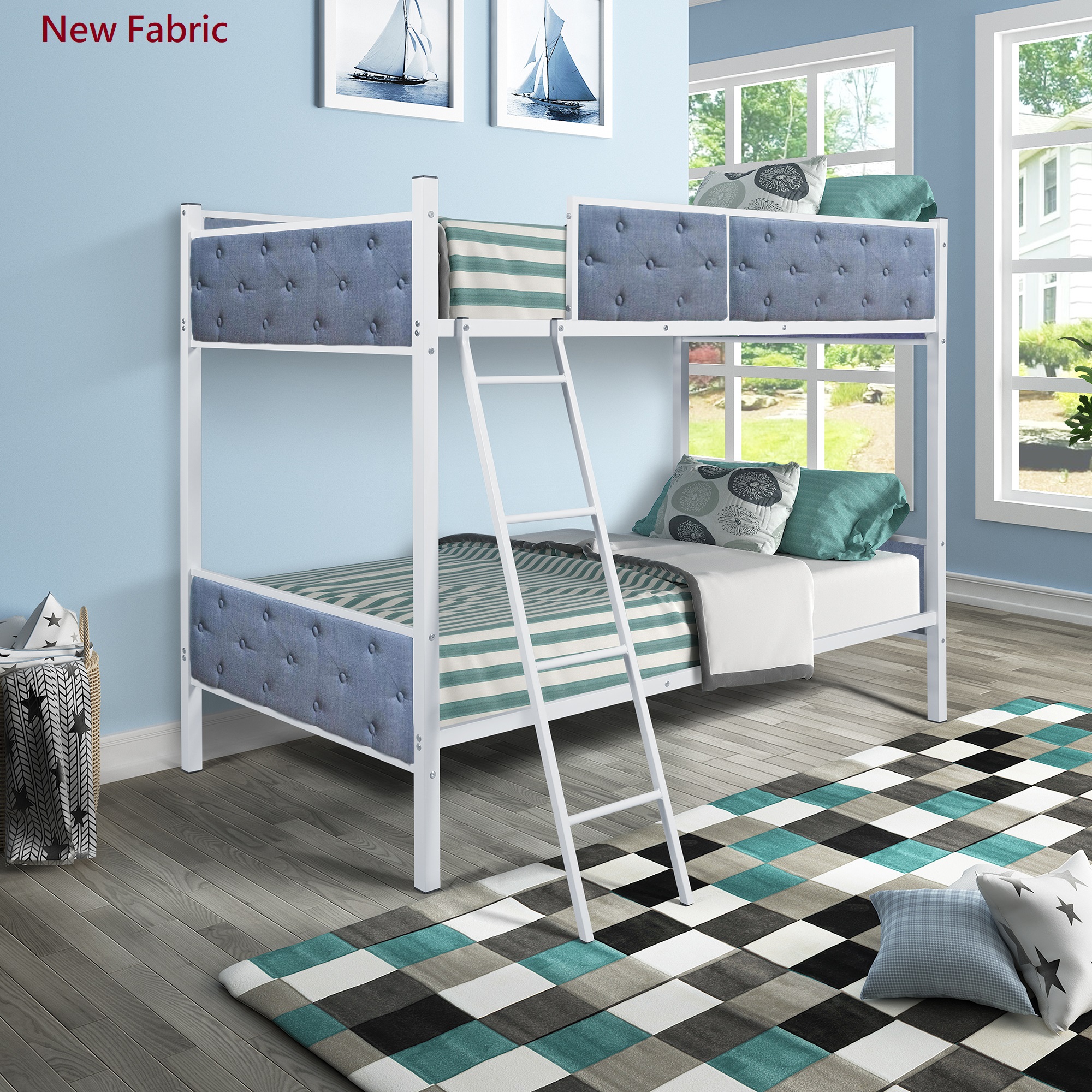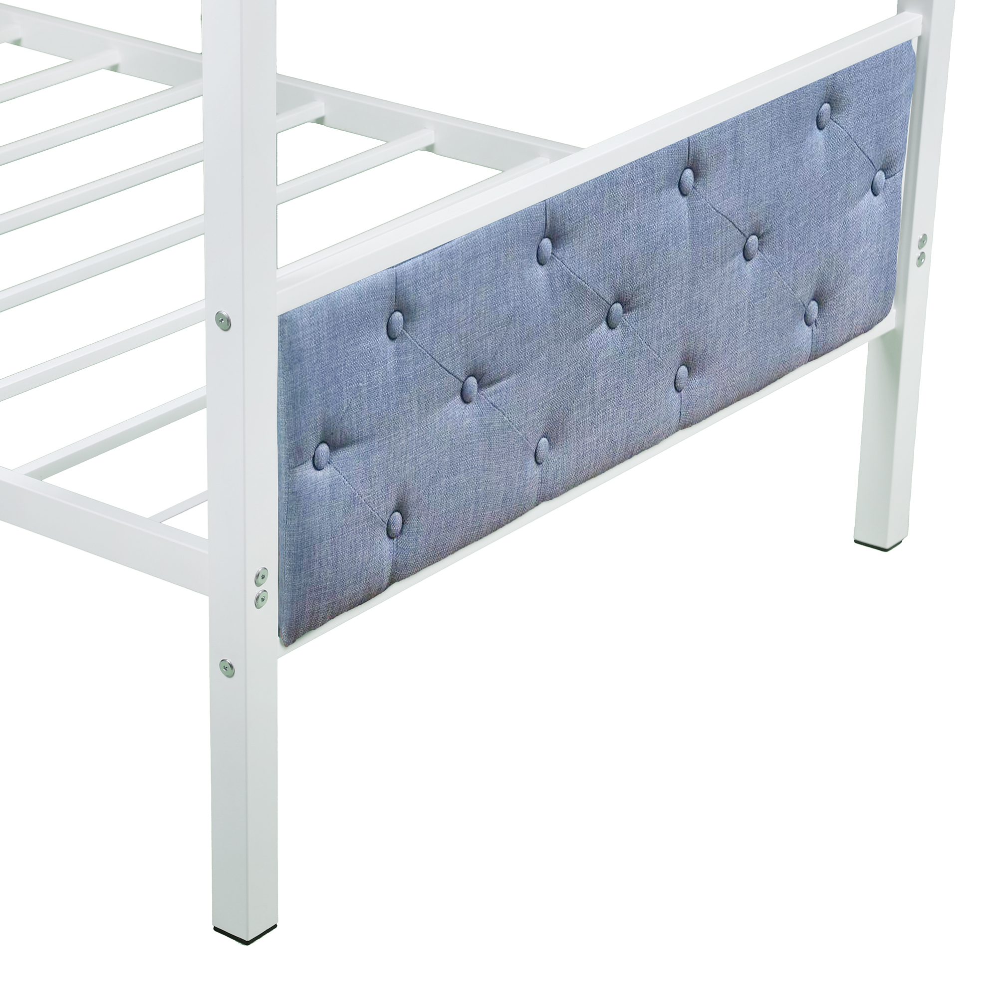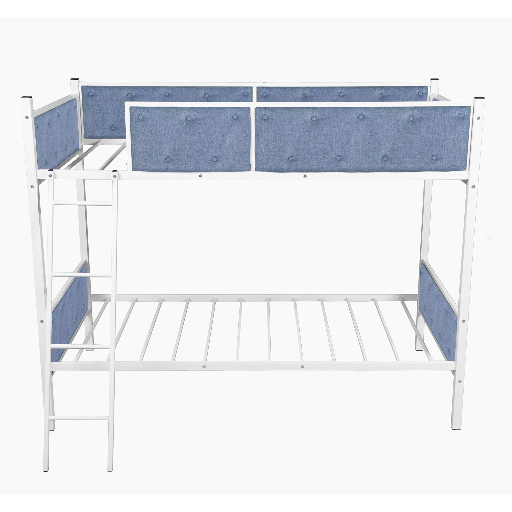 It is not just the place to sleep but a secret kingdom for your little one to play. This bunk bed made by sturdy metal provides extra durability and safety. Additional metal slats support mattresses firmly and extend their life. Full-length guard rails surrounding top bunk gives your child safety and a good night sleep. The upholstered side surrounding also adds warmth and character to your bedroom.