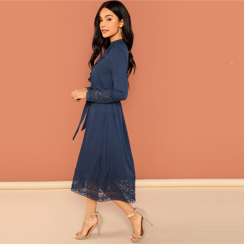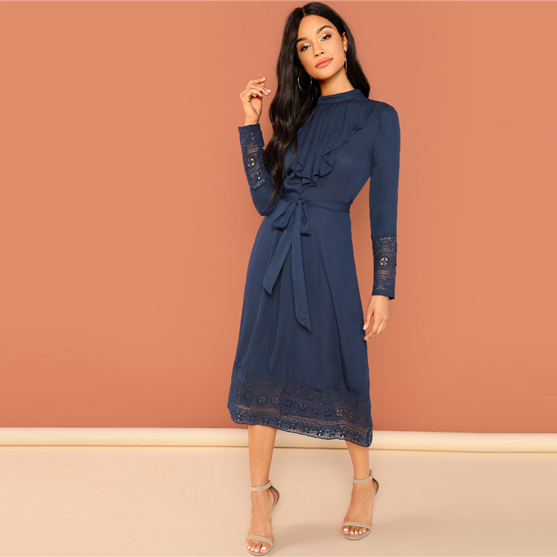Navy Going Out Weekend Casual Pleated Ruffle Trim Lace Trim Dress 2018 Autumn Long Sleeve Elegant Dress Women Dresses