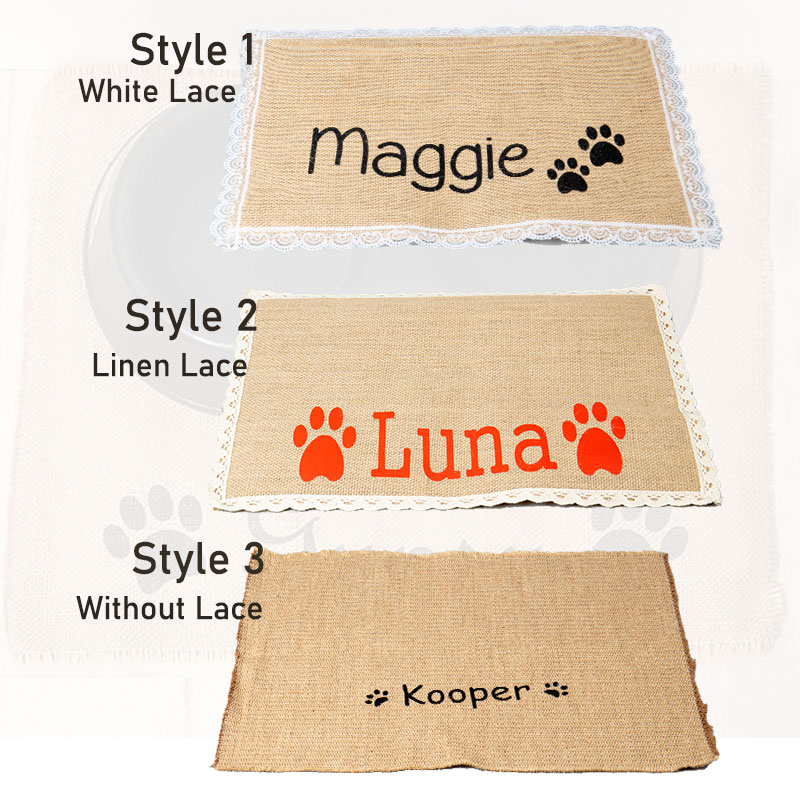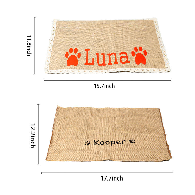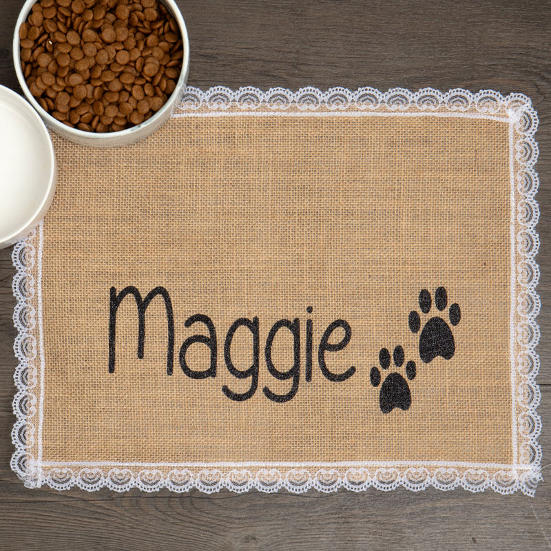 Celebrate your pet by giving them their own personalized placemat to place under their dog food bowl! Custom made with your puppy's name between the paws, it also makes a great gift for dog lovers. Choose from black printing or a variety of colors! Since burlap blends with so many decorating styles; shabby cottage chic, farmhouse country, western ranch, contemporary rustic, it's sure to fit nearly any home decor.