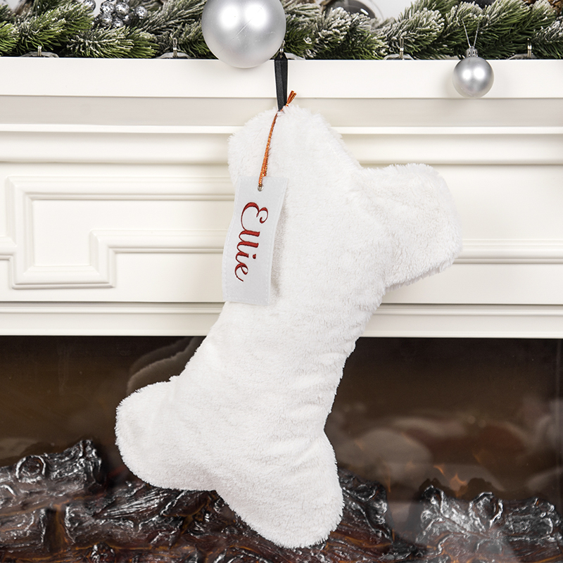 Personalized tag includes small cream ribbon, which can be looped over the stocking’s hanging loop.Name is embroidered on cream tag