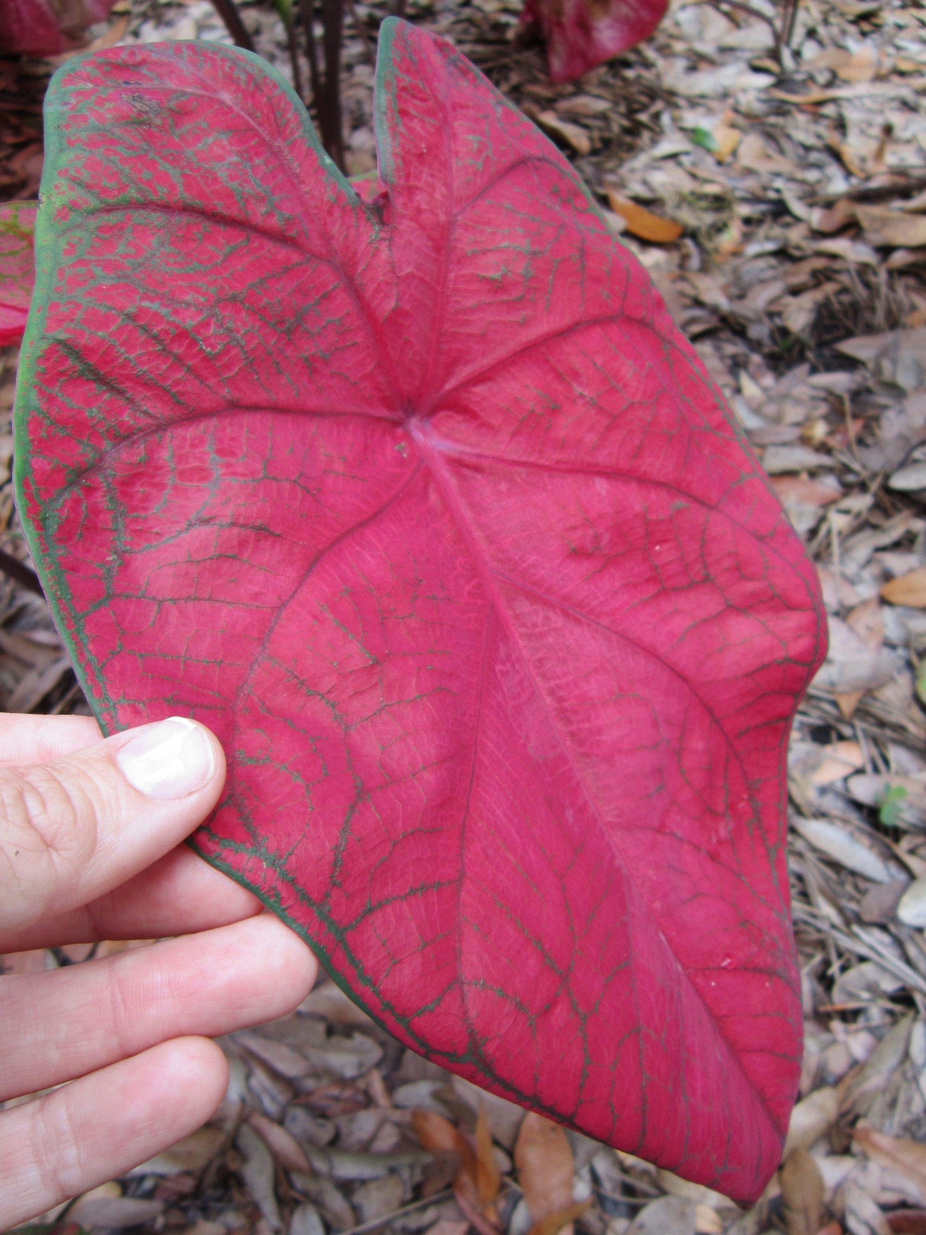 • Fancy-leaf caladiums generally have large heart-shaped leaves, sometimes growing to more than a foot long.