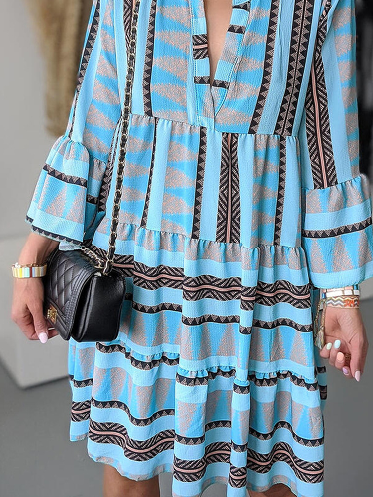 Ladies Dress Elegant Geometric Print V-Neck Flared Sleeves Large Swing Short Mini Dress