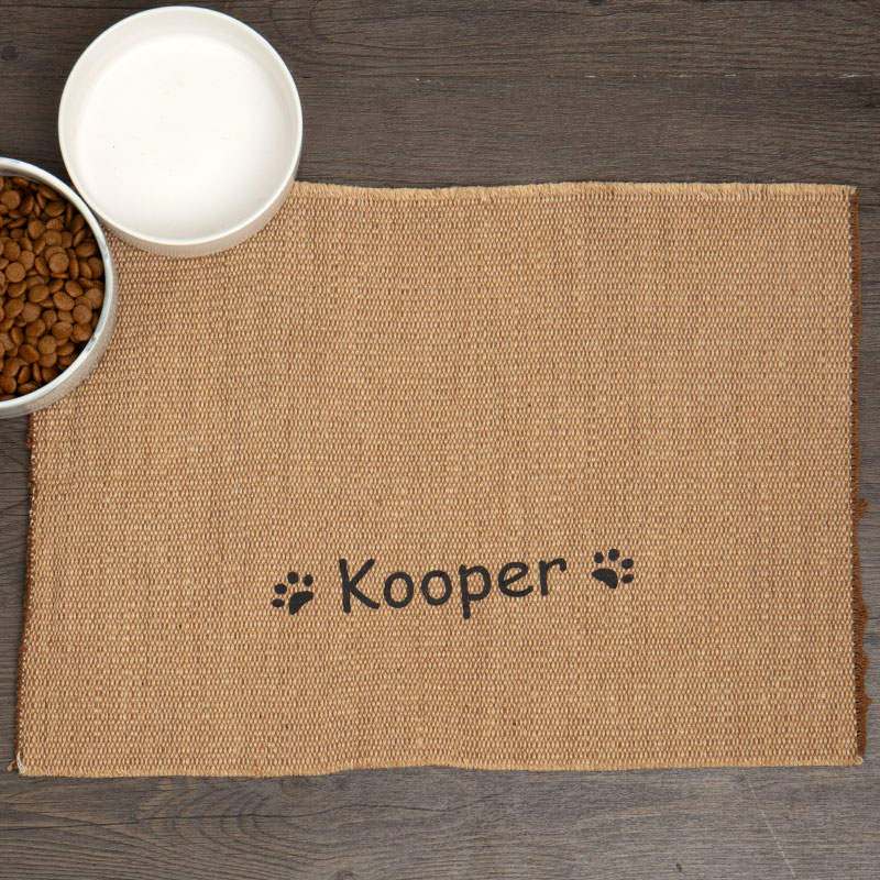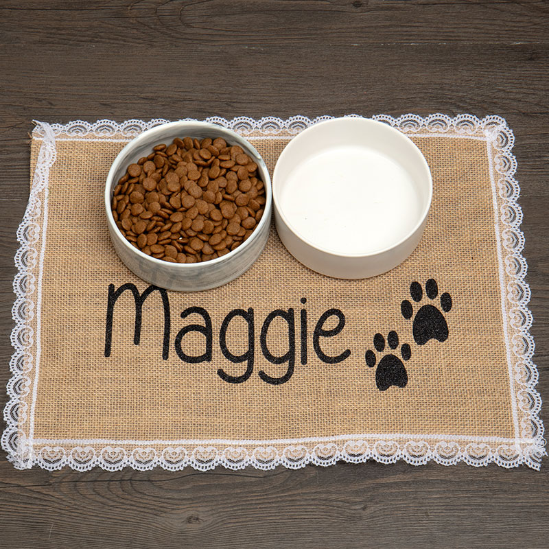 Celebrate your pet by giving them their own personalized placemat to place under their dog food bowl! Custom made with your puppy's name between the paws, it also makes a great gift for dog lovers. Choose from black printing or a variety of colors! Since burlap blends with so many decorating styles; shabby cottage chic, farmhouse country, western ranch, contemporary rustic, it's sure to fit nearly any home decor.