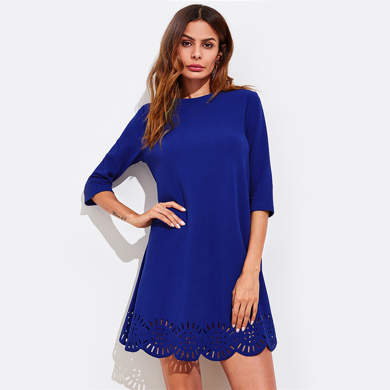 Scallop Laser Cut Hem Swing Dress Royal Blue Three Quarter Length Sleeve Zipper Back Casual Straight Dress