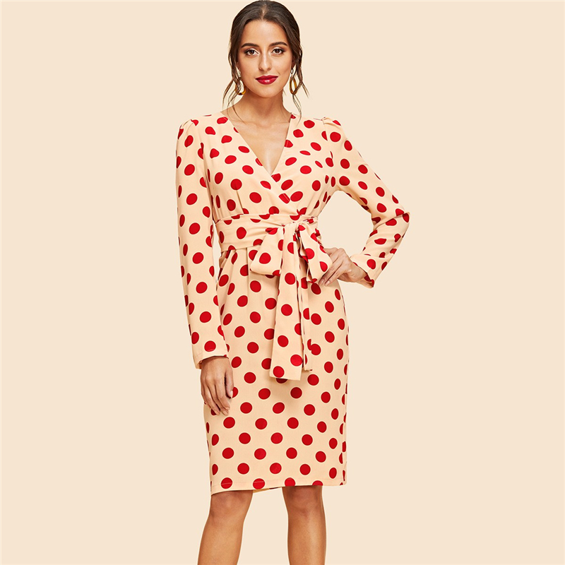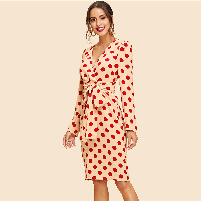 Apricot Vintage Puff Sleeve Polka Dot V Neck Long Sleeve Knee Length Belted Dress Autumn Elegant Modern Lady Women Dresses