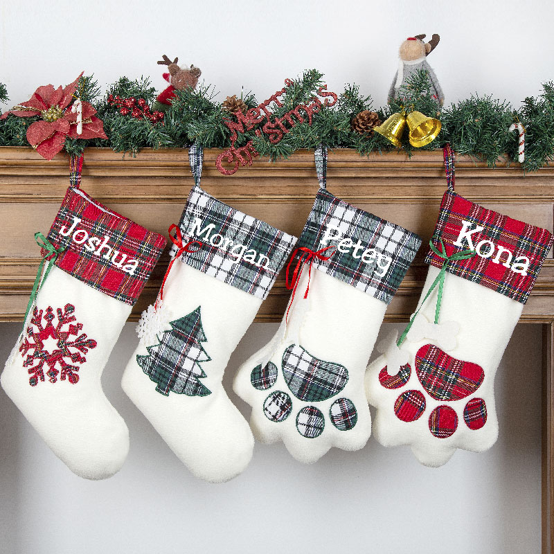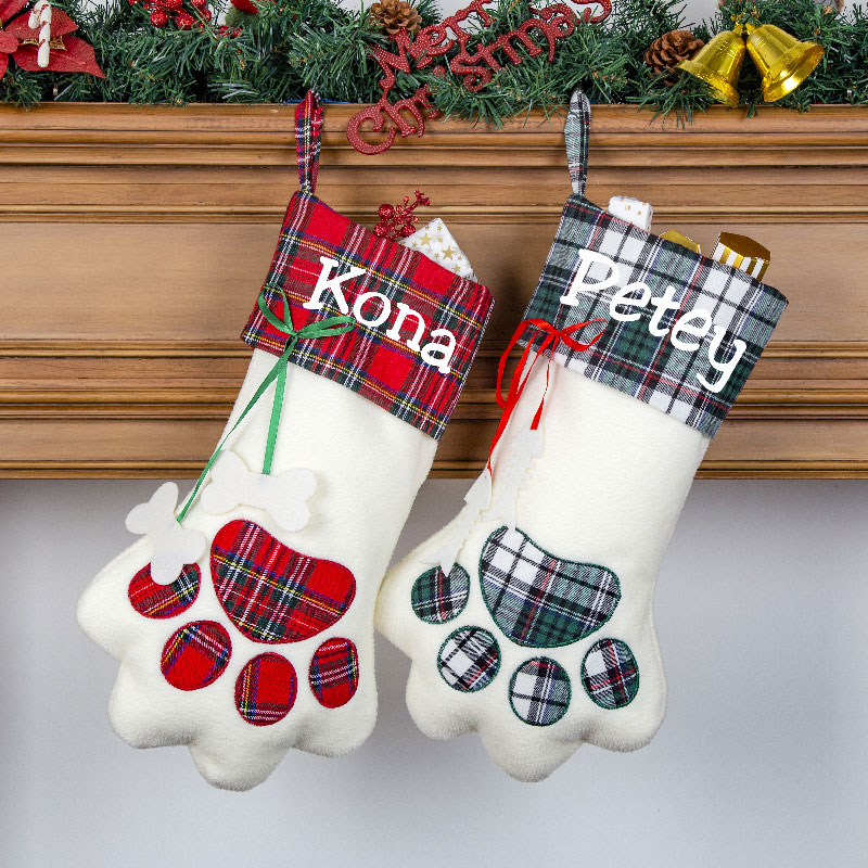 Don't forget all the family members at Christmas times with a new pet personalized Christmas stocking. This paw shaped stocking won't be missed hanging on the mantle.