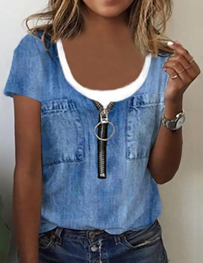 Blue Short Sleeve Color Block Top