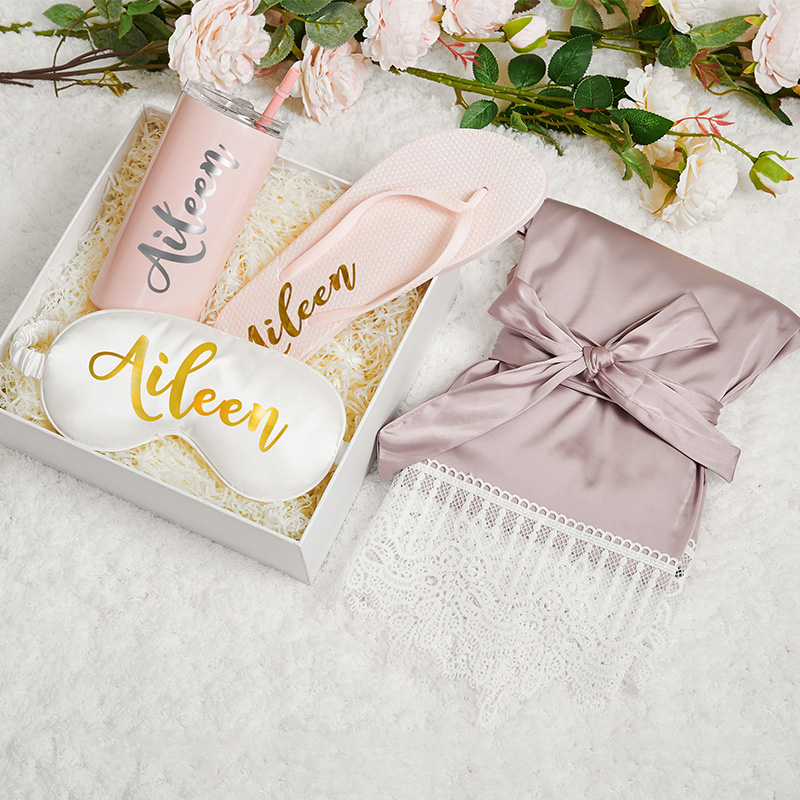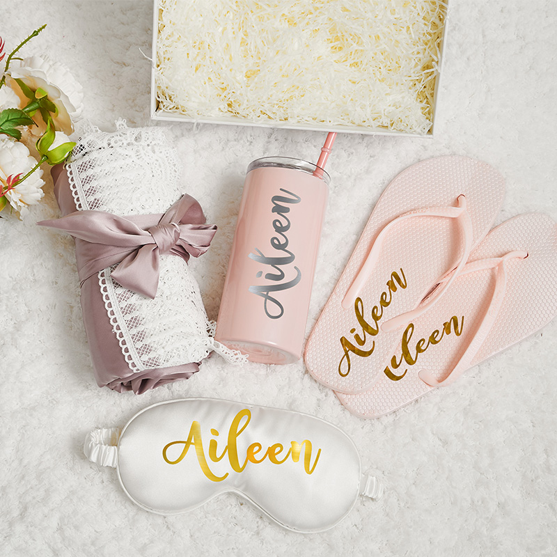 1.Flip Flops2.Robe3.Eye mask4.12 oz Tumbler