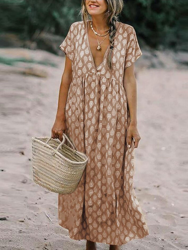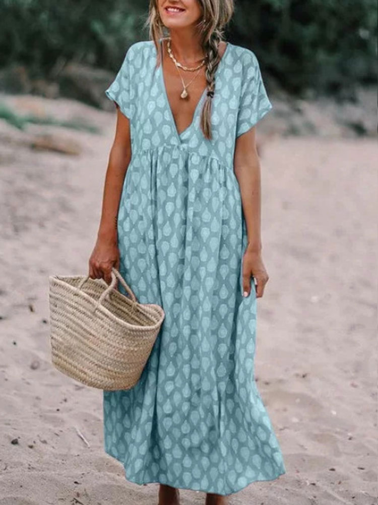 • The style of this short sleeved long skirt is very thin, which can cover the thick legs. The skirt print makes the skirt body not too simple. You can wear it when you go out for an outing and get together with friends.