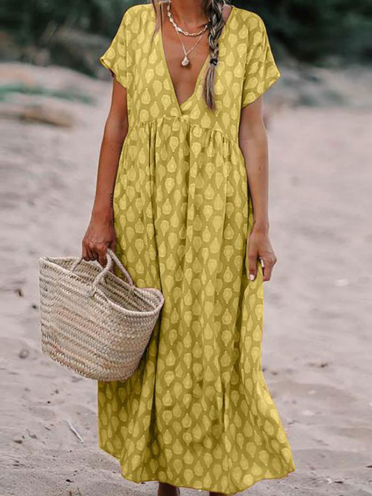 Leaves Printed Long Skirt Set Head Short Sleeve Mid-length Lantern Maxi Dress