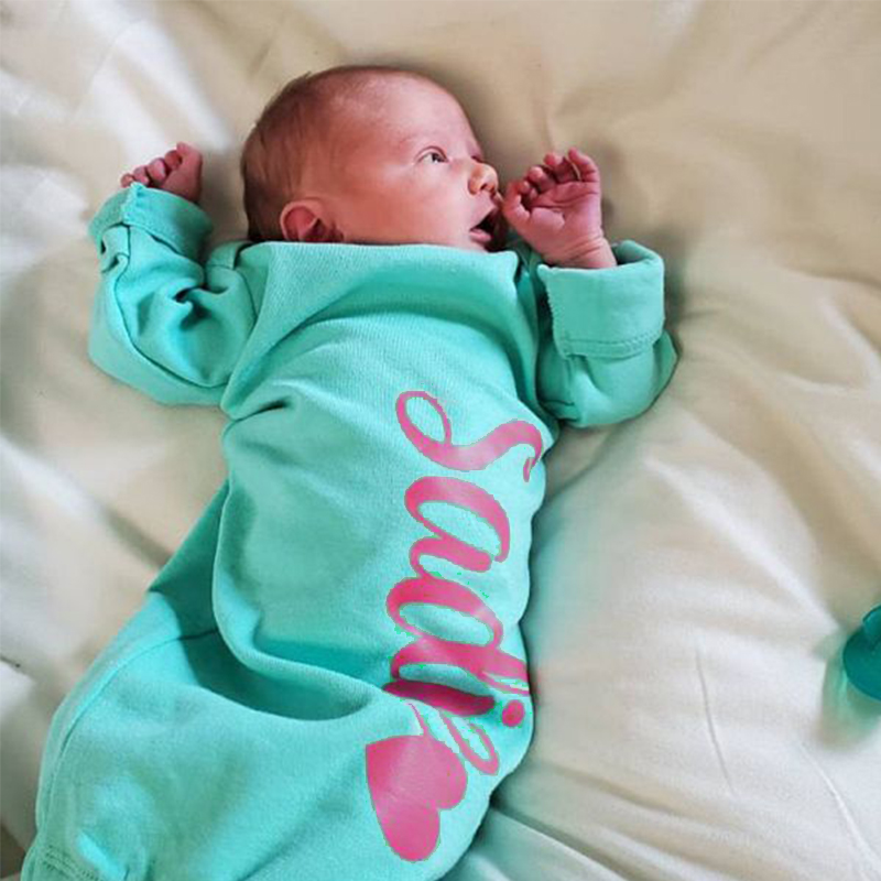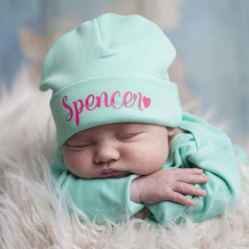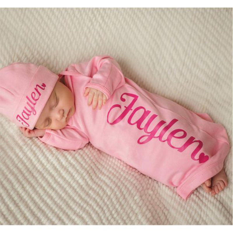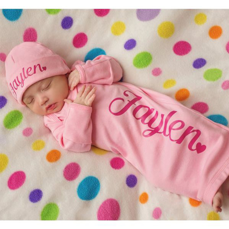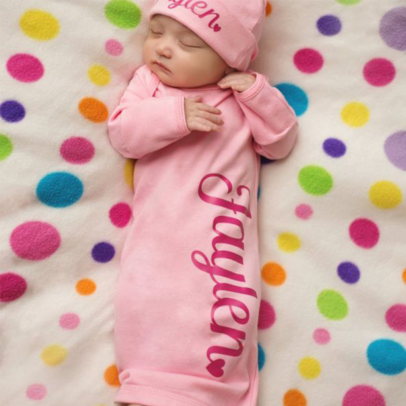 ♥ This adorable personalized baby gown with matching hat set comes personalized with the baby's name! Name is made of heat transfer vinyl and is applied with a commercial heat press. Hat or gown can also be purchased separately using the drop down menu on the side.
