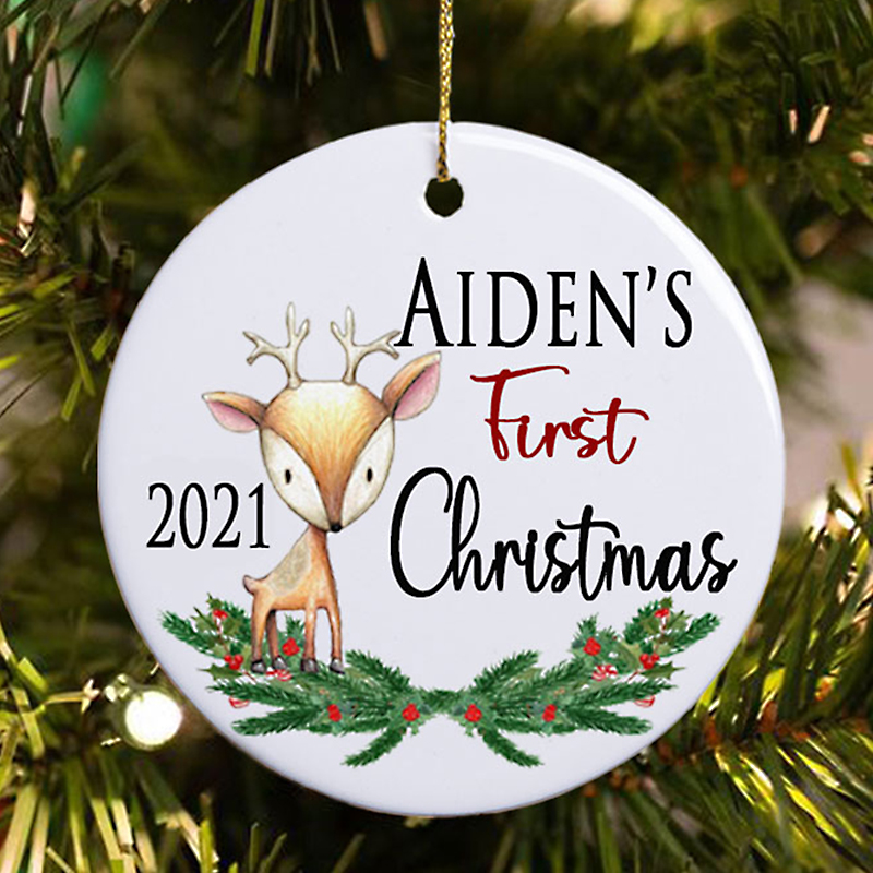 This personalized Christmas ornament is the perfect gift for any new baby. With an adorable graphic, personalized with name and year of the 1st Christmas, this is sure to be an ornament that is treasured for a lifetime.
