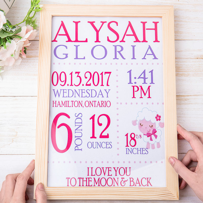 This cute decor displays baby's name, date of birth, time of birth, weight, and height. It will make an adorable addition to any nursery, and is a unique baby shower gift. It's available for both boys and girls.