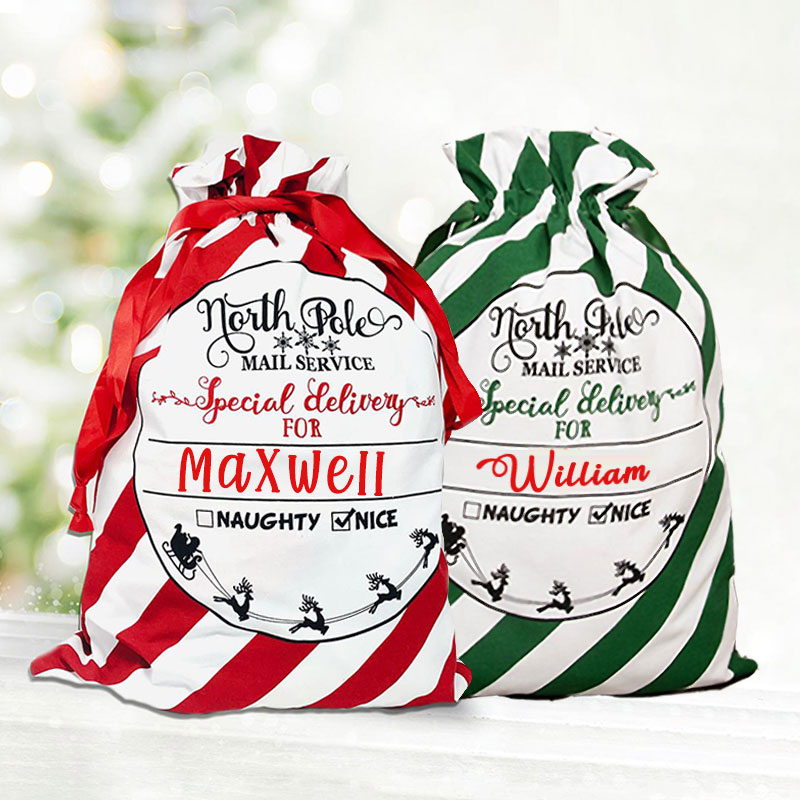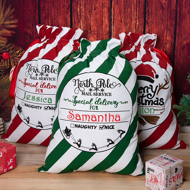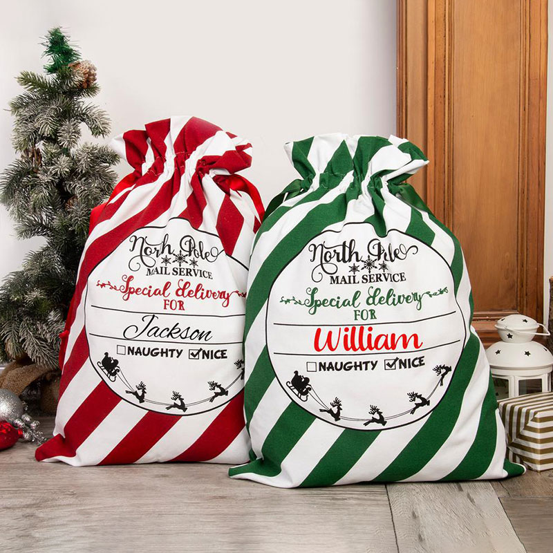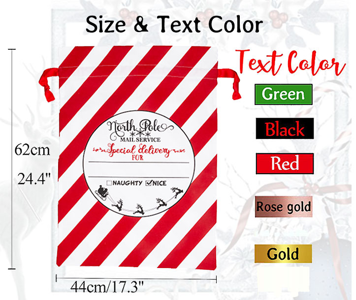 Each santa sack is made of 100% cotton fabric, in a Natural color, equipped with a side carrying strap (to make it easy for santa to lug around) and drawstring closure at the top.