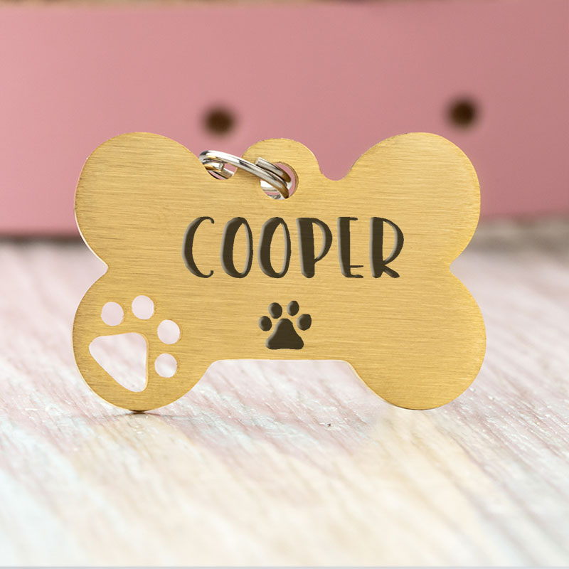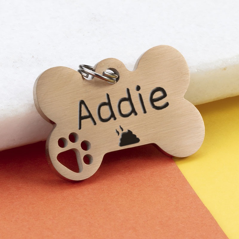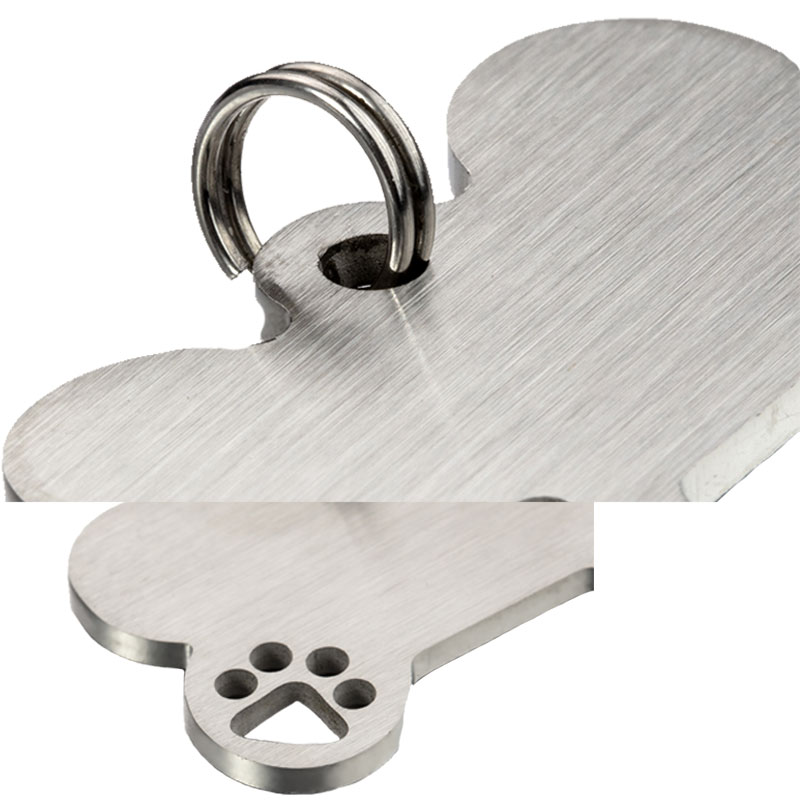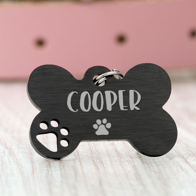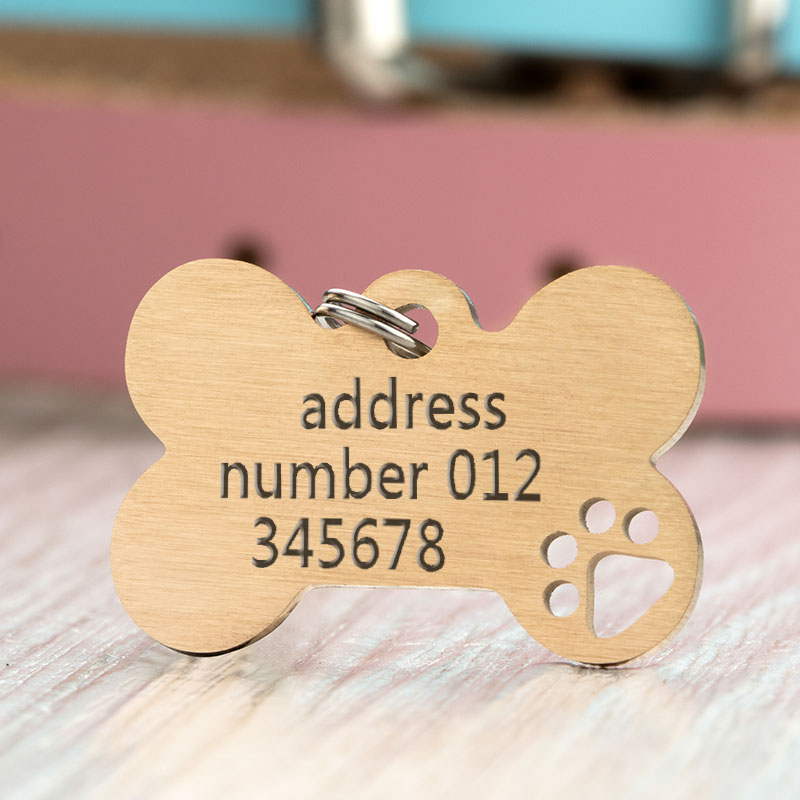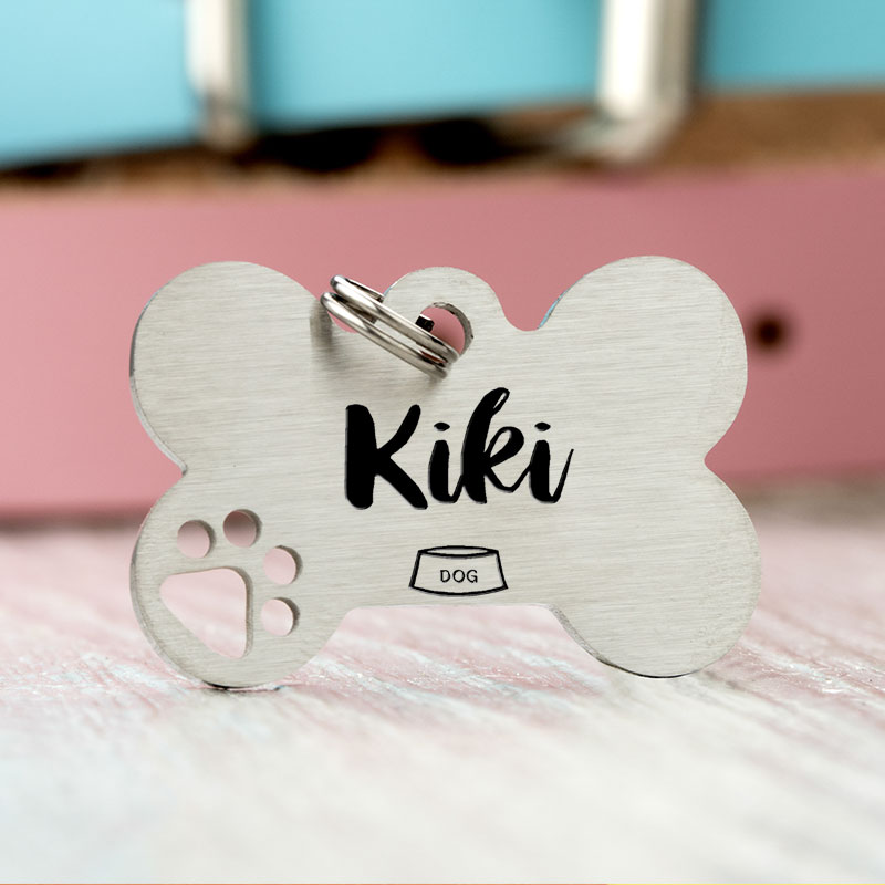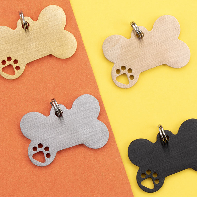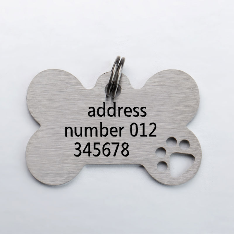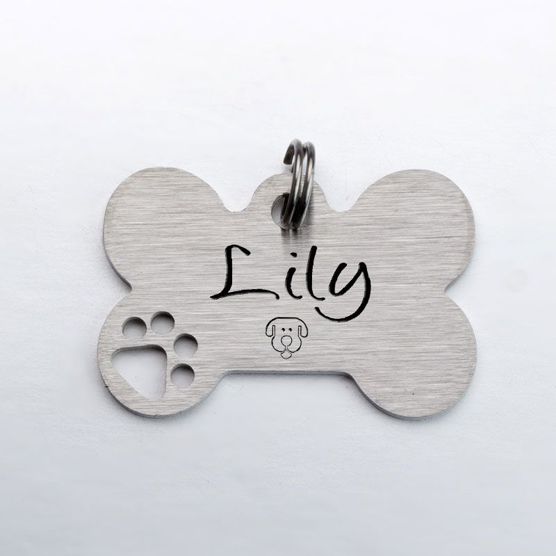 Personalized stainless steel pet ID tags with front and back engraving. Choose between 4 fonts. Comes with ring to attach to a collar.