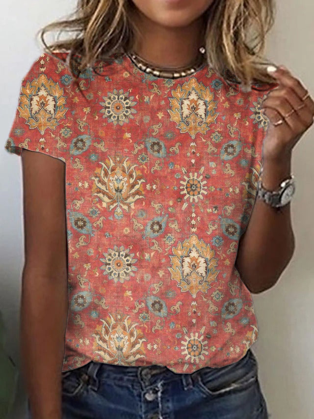 - Groovy, baby! This retro floral print short sleeve top makes any moment picture-worthy with its pretty pattern and slim fit. Mix and match this lightweight T with jeans, cut-offs, a skirt, leggings, cowboy boots, or flats and sandals for a unique style at any time. Machine wash cold tumble dry low to medium heat. Iron if needed or lay flat to dry.