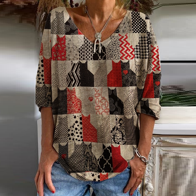 Vintage Cat Patchwork Pattern Long Sleeve Tops