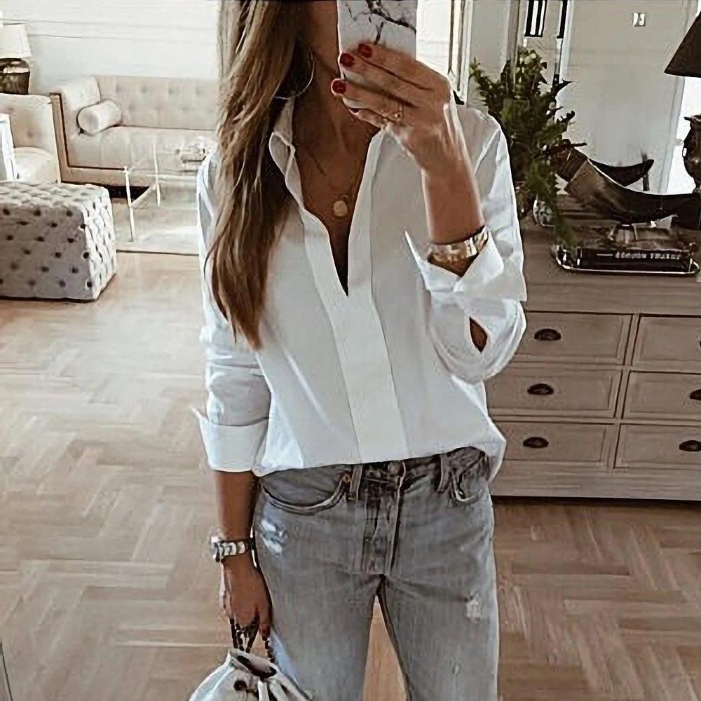 Casual Shirt Collar Plain Long Sleeve Blouse