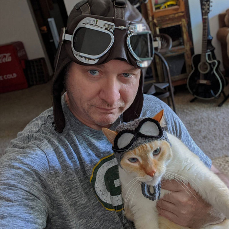 Crocheted aviator hat for average size cats and small dogs (under 20 lbs).