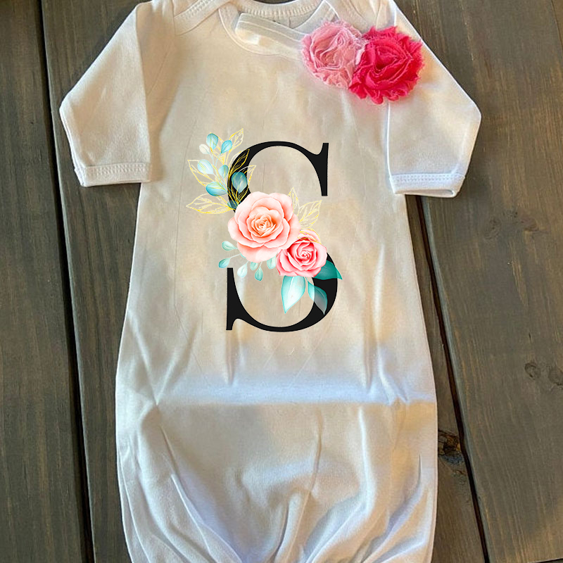 This darling gown is a truly unique little gown. With her name printed down the gown in a stunning black, and pink floral design. This gown is just perfect for those darling newborn pictures.