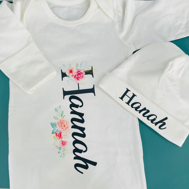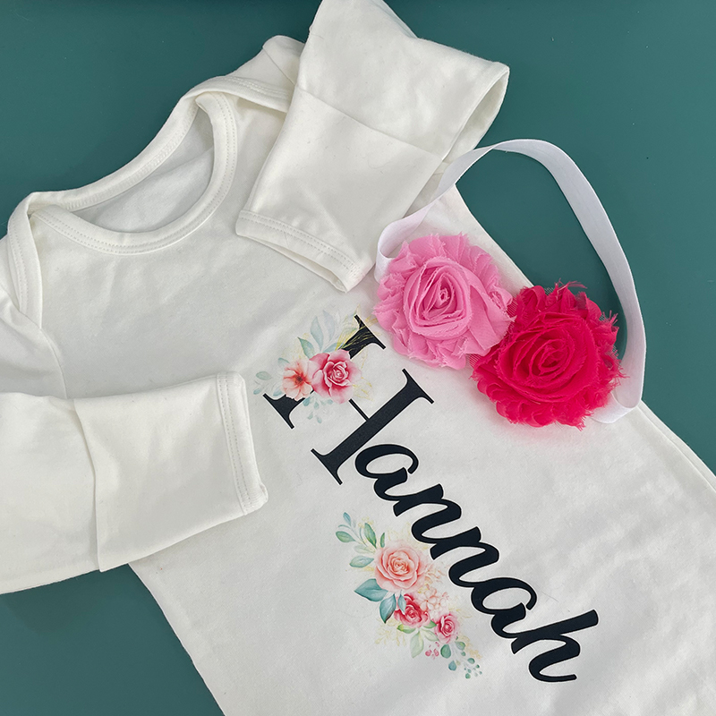 ♥ This adorable personalized baby gown set comes personalized with the baby's name! Name is made of heat transfer vinyl and is applied with a commercial heat press.