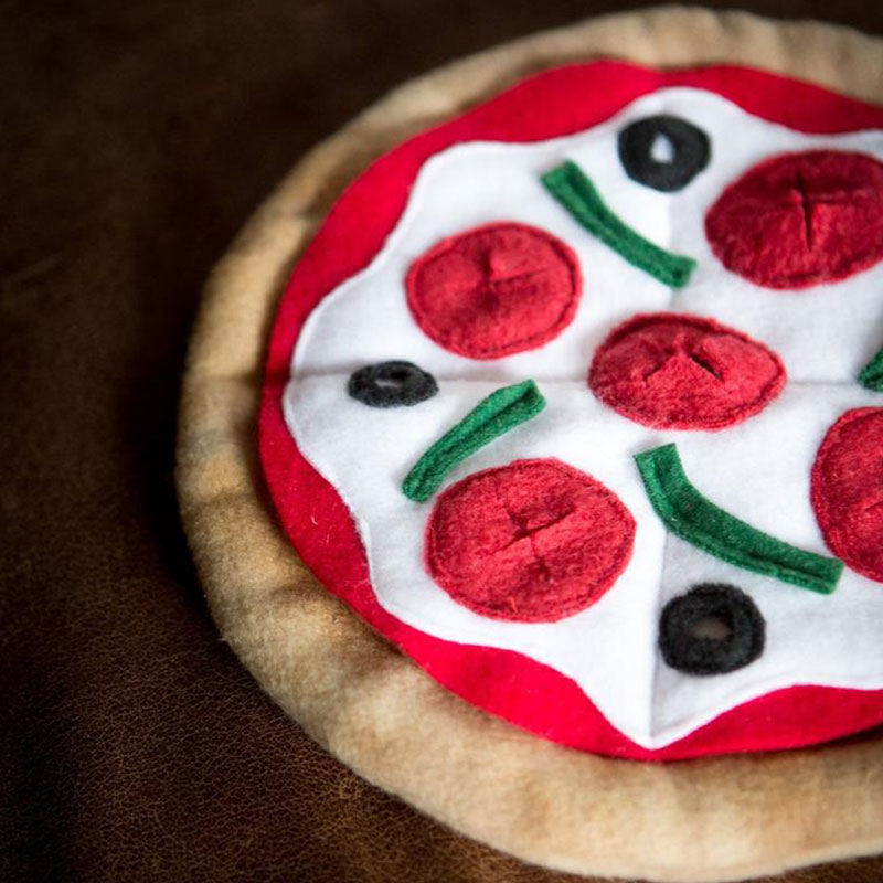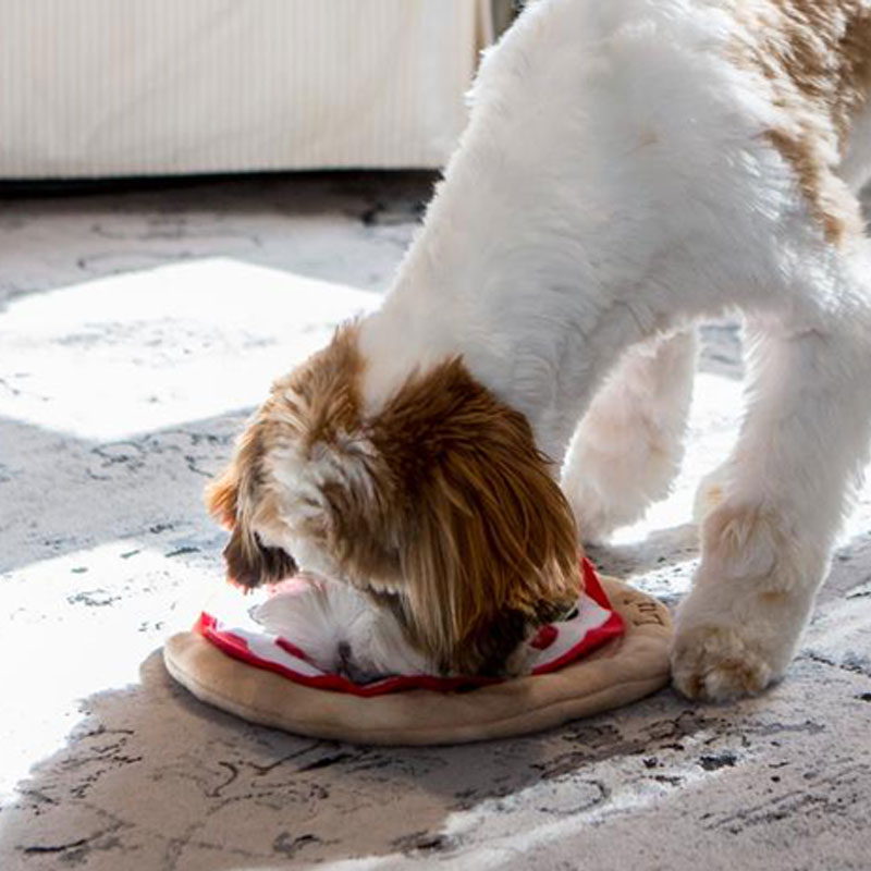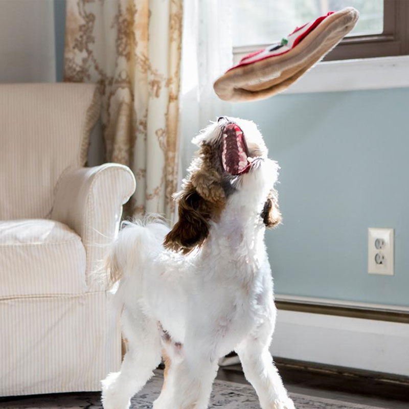 Soft frisbee-like toy that can both be snuggled with, a brain game by hiding treats in it's nooks and a frisbee!