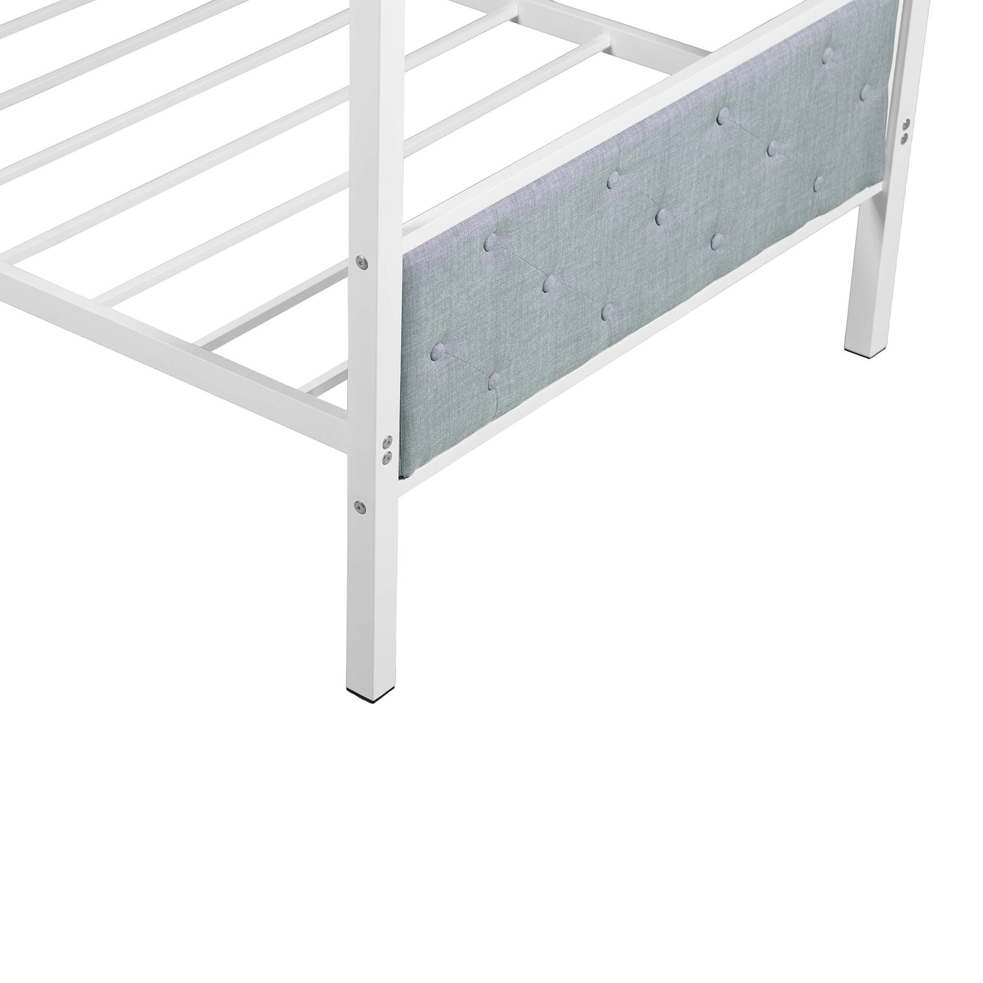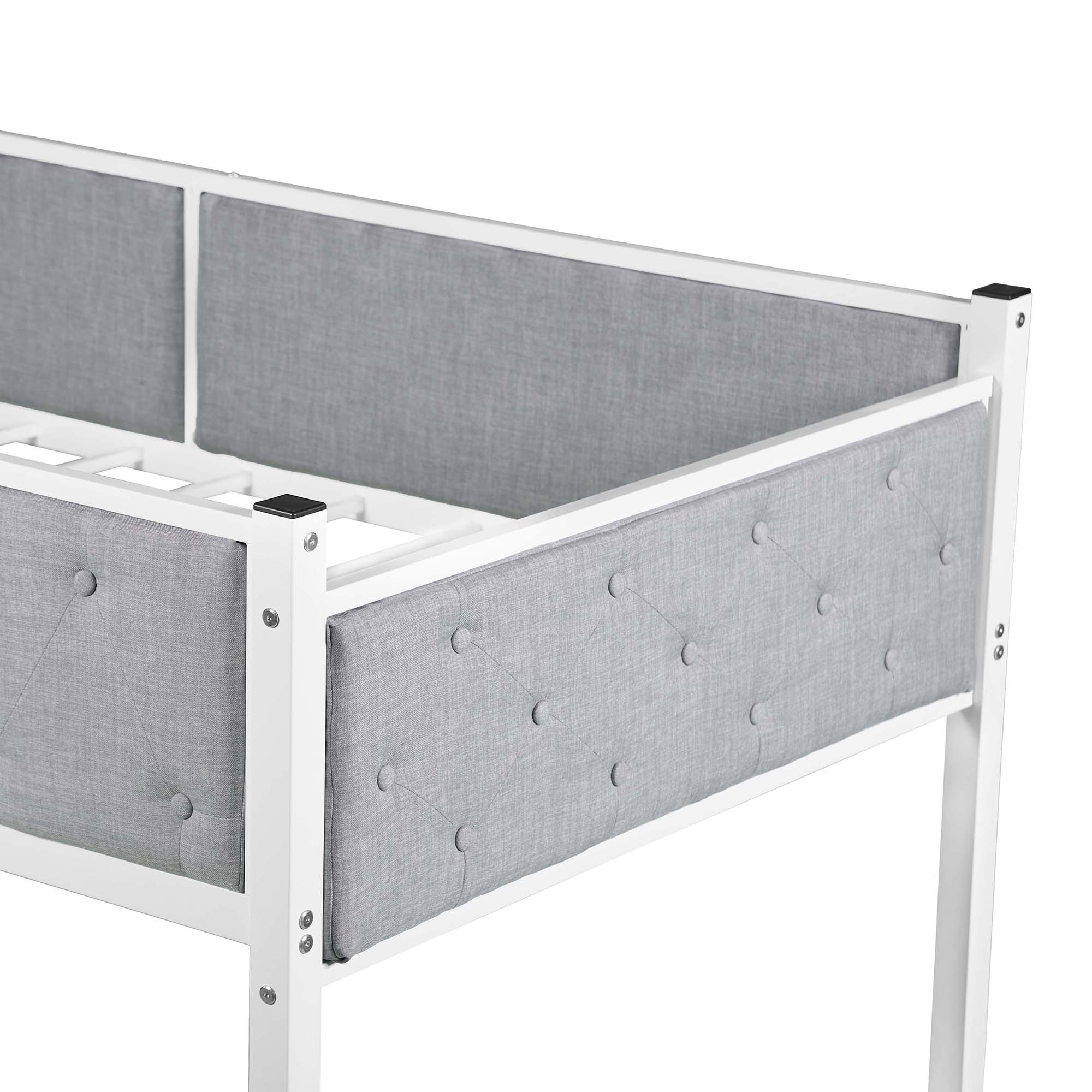 It is not just the place to sleep but a secret kingdom for your little one to play. This bunk bed made by sturdy metal provides extra durability and safety. Additional metal slats support mattresses firmly and extend their life. Full-length guard rails surrounding top bunk gives your child safety and a good night sleep. The upholstered side surrounding also adds warmth and character to your bedroom.